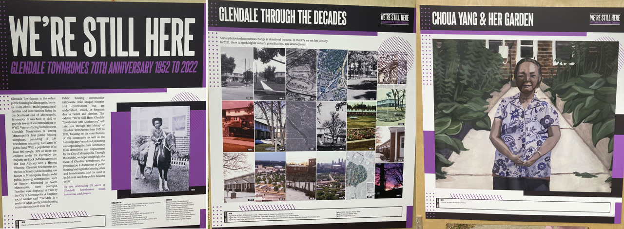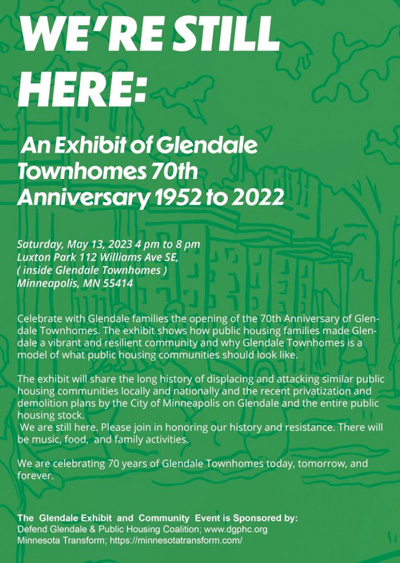 "Celebrate with Glendale families the opning of the 70th Anniversary of Glendale Townhomes. The Exhibit shows how public housing families made Glendale a vibrant and resilient community and why Glendale Townhomes is a model of what public housing communities should look like. The Exhibit will share the long history of displacing and attacking similar public housin communities locally and nationally and the recent privatization and demolition plans by the City of Minneapolis on Glendale and the entire public housing stock.